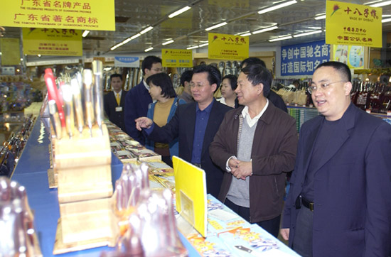 圖片說明: 中央紀委紀檢組副組長、國家監察局駐國家旅游局監察局局長李廣和(前排右二),在陽江市委常委、副市長鐘毅(前排右三),陽江十八子集團總經理李積回(右一)等陪同下參觀十八子商場.(丁向明攝)