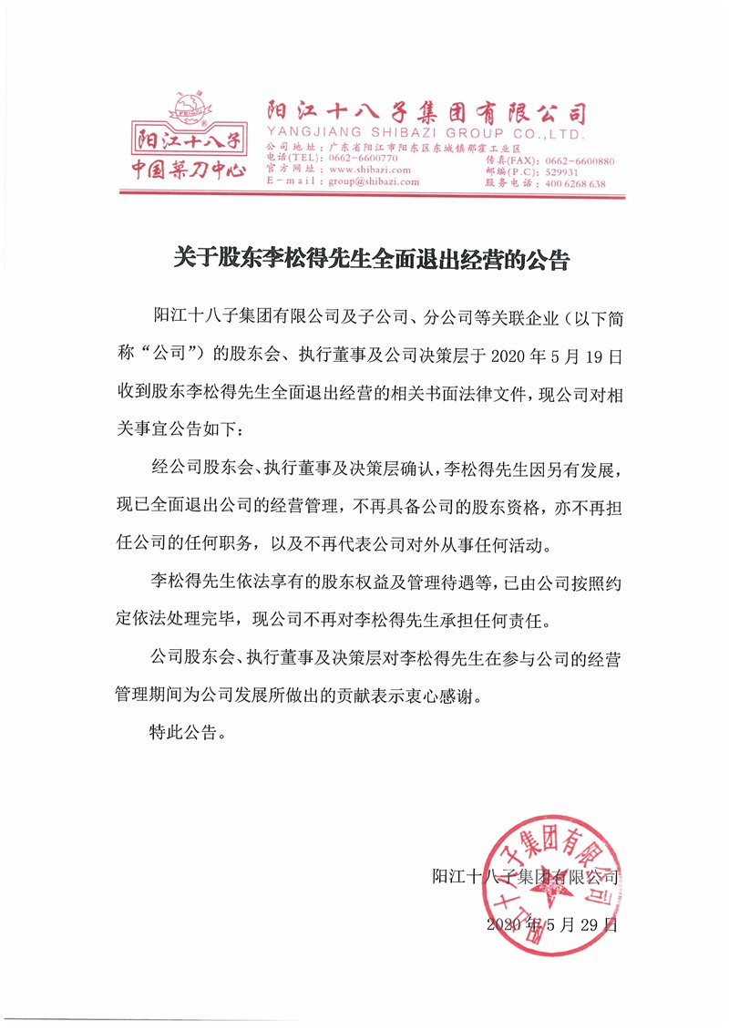 關(guān)于股東李松得先生全面退出經(jīng)營(yíng)的公告